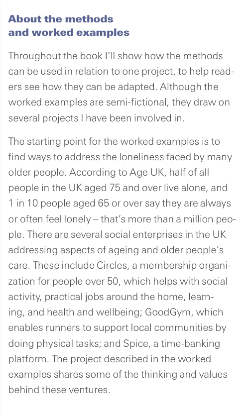 Accompanying each method is a worked example, to help readers understand how the method and associated template can be used at the early stage of designing an innovative service. You’ll see how the tool can be adapted to the matter in hand. They are not rigid frameworks to be followed, but rather guides to help order idea generation and developing a shared understanding about issues and opportunities to address them.